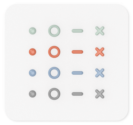 Guzas etikečių yra keturių formų ir spalvų, iš viso 16 etikečių. Figūrų variantai yra vientisas taškas, atviras apskritimas, brūkšninė linija ir X. Kiekvienas figūros variacijos yra žalios, oranžinės, mėlynos ir pilkos spalvos.