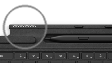 "Surface Pro Keyboard" (arba "Type Cover") serijos numerį galite rasti šalia jo stuburo (srities, kuri prisitvirtins prie "Surface") kairėje pusėje arba centre. Serijos numeris yra skaitmenų eilutė, kuri atrodo maždaug taip: XXXXXXXXXXXX |